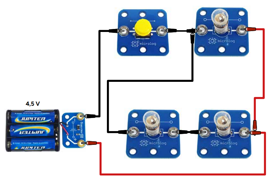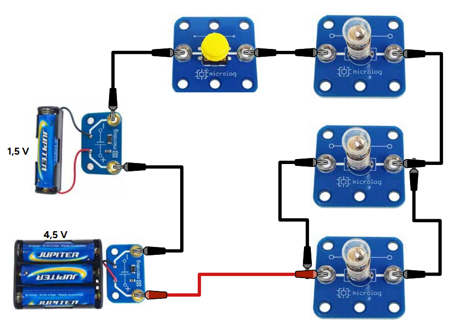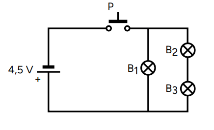 Mientras se presiona el pulsador P, la tensión de 4,5 V llega a las tres bombillas y se encienden.