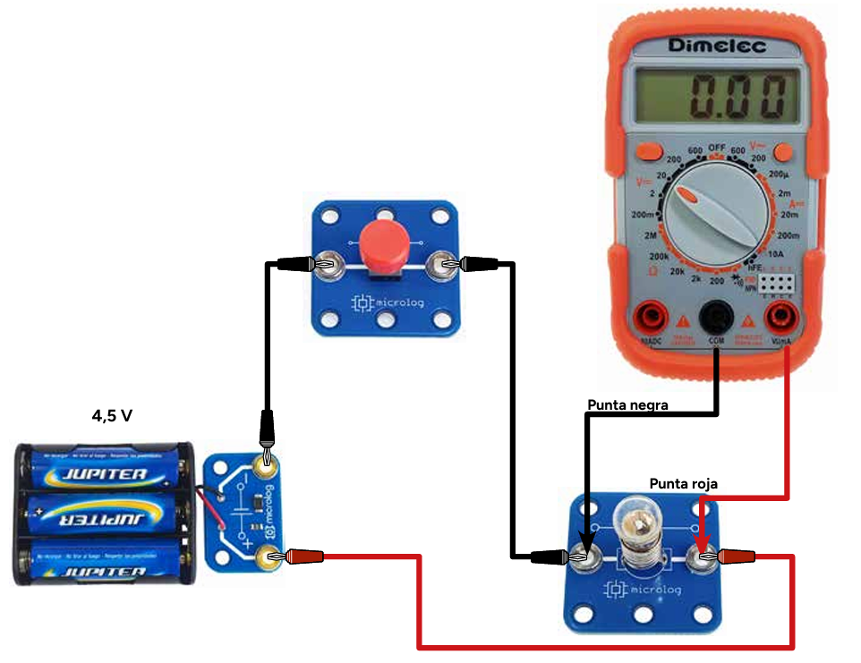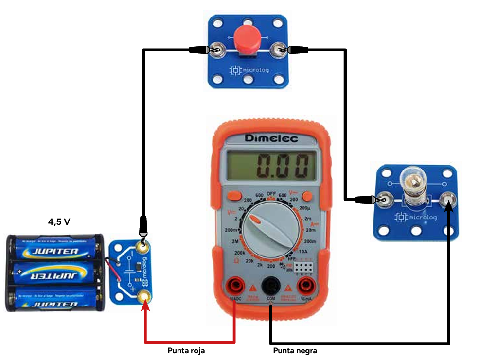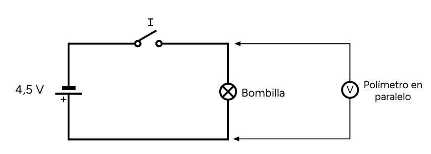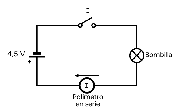 Mientras se presiona el interruptor I, la corriente eléctrica de la pila llega a la bombilla B, la enciende y atraviesa también el polímetro