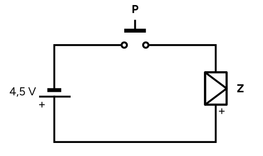 Mientras se presiona el pulsador P suena el zumbador Z por el paso de la corriente eléctrica producida por la pila.