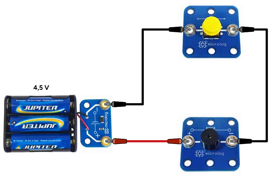 El minikit pulsador permite el paso de la corriente eléctrica mediante una lámina metálica. Mientras se mantiene pulsado, la lámina metálica baja, hace contacto con los extremos de las conexiones y cierra el circuito.