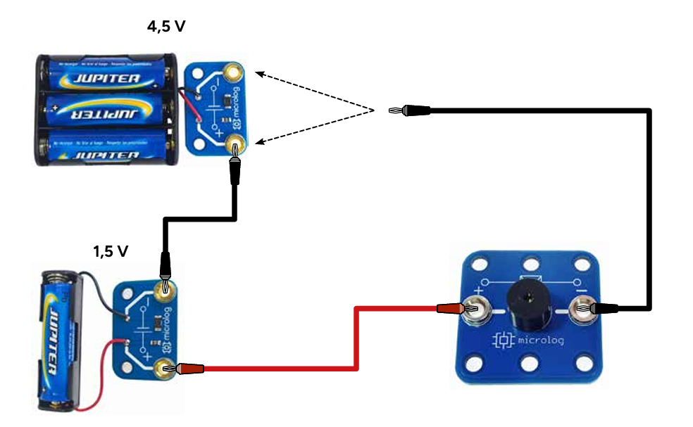 Conectando el cocodrilo C al punto A, se aplica 1,5 V al zumbador y suena. Repitiendo la operación con el punto B, al zumbador le llegarán 6 V y sonará más fuerte y agudo.