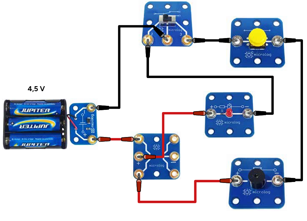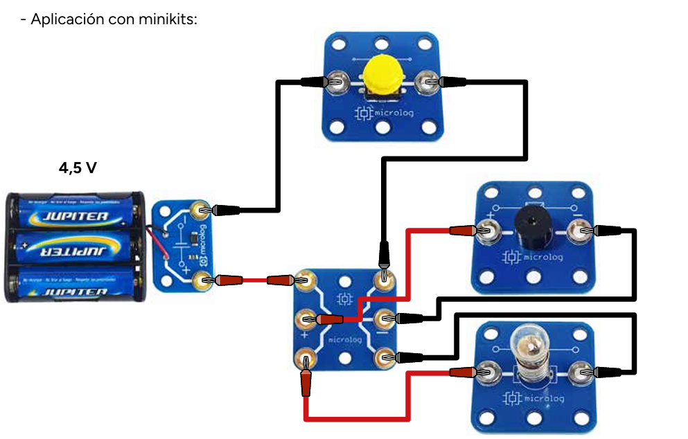 Aplicación con minikits. Hay que tener la precaución de conectar el positivo del zumbador (rojo) con el positivo de la pila (rojo)