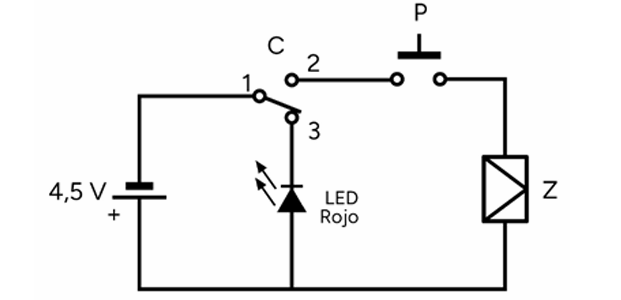 Durante el tiempo que se esté presionando el pulsador P, la tensión V de la pila se aplica a la bombilla B y al zumbador Z en paralelo